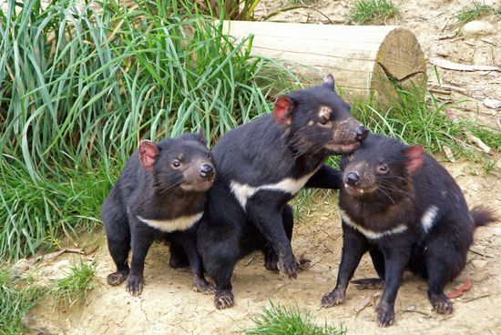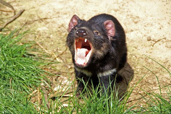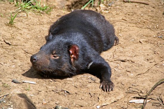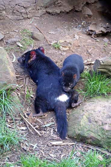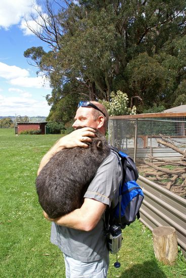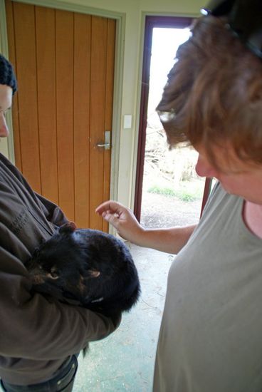 Dann holte er Sally, ein Tasm. Teufel-Weibchen. Auch sie durften wir streicheln und er zeigte uns ihr Junges im Beutel. Sie züchten hier wie verrückt, weil in freier Wildbahn, wie schon geschrieben, die meisten Teufel sterben. Der Genpool ist nicht groß und so versuchen sie auch zusammen mit den Aussie Zoos zu kreuzen, damit sie irgendwann mal 5000 Tiere haben, um auswildern zu können.