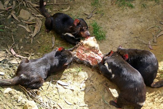 Zum Dinner gab es wieder lecker Wallabie (totes von der Straße), die Bilder sprechen für sich. In der Natur töten sie Wombats und schlagen sich total den Bauch voll. Das dürfen sie auch einmal die Woche hier mit Wallabie. Danach sind sie für einen Tag satt.