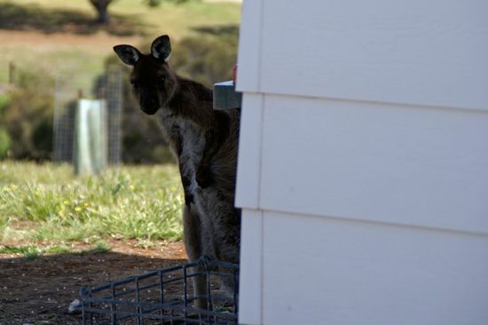 Am Hafen stand eine Frau mit einem Schild mit unserem Namen, um uns abzuholen. Obwohl das Mietwagenoffice höchstens 150m entfernt war. Im Office erklärte sie uns 'ne halbe Stunde das Autofahren u.a. auf KI. Strikt verboten zwischen Dämmerung und Morgengrauen zu fahren! Es gibt 2 innere Routen, die geteert sind, die anderen 98% der Strassen unsealed Gravelroads. Zwischen 40 und 70 kmh fahren und immer vorsichtig, nirgends werden so viele Kängurus überfahren wie hier. Dann: Schlangen-Hochsaison, nur eine der vielen Arten ist nicht giftig! Also siehst du eine, egal wie groß - renne !! Nicht baden, weißer Hai! Nur in 2 geschützten Buchten kann man es wagen, ins Wasser zu gehen! Nur 4 Zapfsäulen (Tankstelle kann man dazu nicht sagen), 2 Läden. Uns so ging es immer weiter...