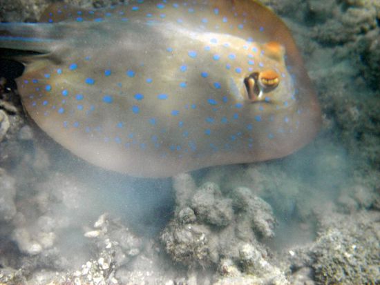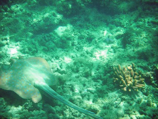 Ab mittags kam die Ebbe und es war nun einfacher das Riff zu fotografieren, da es nicht mehr so tief war. Als erstes gleich den Pünktchen-Rochen entdeckt.