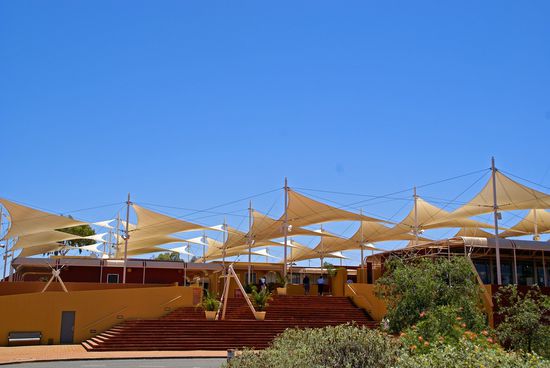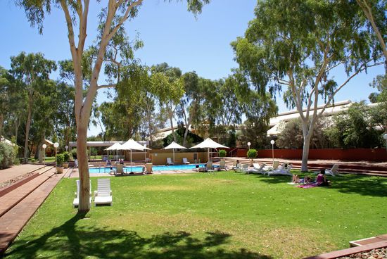 Wir lieferten unser Auto ab und checkten für den Flug zum Ayers Rock ein. Der erste Flug dauerte 2 Stunden bis ins rote Zentrum - Alice Springs. Dort hatten wir 2 Stunden Aufenthalt und dann flogen wir eine halbe Stunde genau bis zum Yulara Airport. Die einzigste Siedlung rund um den Uluru ist Yulara, mit einem riesigen Resort, welches vom Backpacker bis zum Luxushotel alles beherbergt. Wir haben 3 Nächte im Desert Gardens Hotel, eine Nacht, das muss mal erwähnt werden, für 255 EUR. Aber für den Komfort, am Uluru zu wohnen und bei der Hitze nicht im Zelt sein zu müssen, muss man halt zahlen. Aber es ist super!