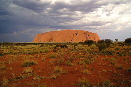 Okay, nach der Landung holten wir das Auto von Hertz ab und fuhren zum Hotel. Zu diesem Zeitpunkt sahen wir schon einige schwarze Wolken über dem Resort und dachten, schnell zum Uluru fahren und "Guten Tag" sagen. Am "Eingang" des Aboriginielandes erstanden wir den 3-Tagespass und düsten zum ersten Aussichtspunkt. Auf einmal blitzte und donnerte es so stark, wie ich es so noch nicht erlebt habe. Uns wurde himmelangst und wir entschlossen uns zurück zu fahren. Es gab richtigen Starkregen und die Temperatur stürzte von 40 °C auf 20 °C runter. Das im heissen Outback! Am Hotelparkplatz standen wir schon knöcheltief im Wasser und mit dem Gepäck mussten wir durch Wassermassen von unten und von oben. Zum Glück sind 20 Grad ja auch noch ziemlich warm. Alles stand unter Wasser und den Angestellten zu folge, passiert das hier wirklich nicht oft! Durch die Hitze und den Regen duftete die Luft absolut so, als wenn man in der Sauna einen Eukalyptusaufguss macht. Die ätherischen Öle der Bäume müssen alle freigesetzt worden sein.