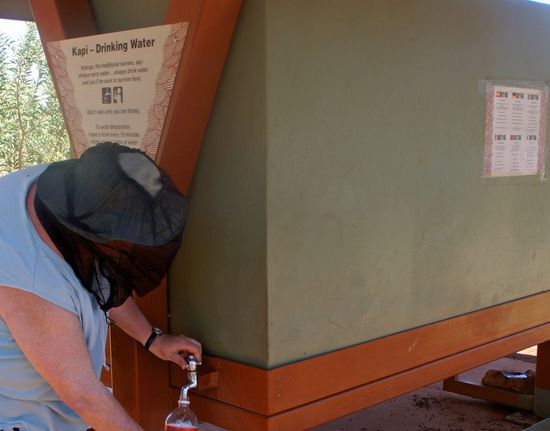 Überall wird auf das Trinken hingewiesen und es gibt auch Wasserstellen und Emergency-Buschradios. Mit dem 50iger Sonnenschutz passierte mir Sonnenbrandtechnisch auch nix.