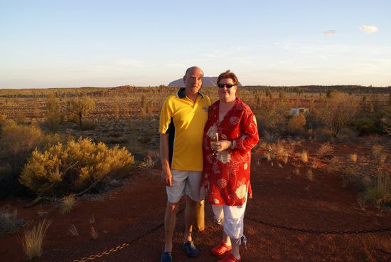 Hier spielte einer Digeridoo und es gab Sekt und Canapees - Krokodil mit Lemon, Känguru und Lachs. Der Uluru wurde nicht angeleuchtet von der Sonne, der Untergang fand über den Olgas statt.