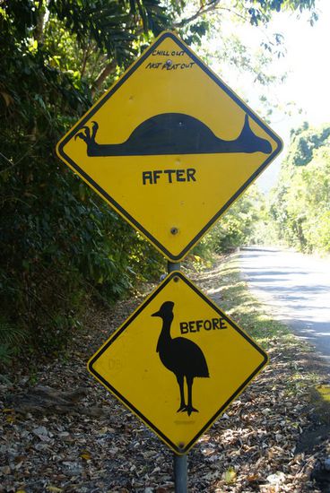 Am Cape Tribulation, unserem "Endpunkt", gibt es auch nur noch Wildnis. Auf der Strasse findet man zig von den "Schneckenpollern" und tausende Warnschilder vor Cassowaries, deren Gebiet es hier ist. Aber gesehen haben wir leider keinen.