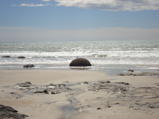 am naechsten tag sollten sich unsere wege dann trennen, da die maedels zum arbeiten und ich nach Dunedin fahren wollte. wir haben aber noch eine must-see sehenswuerdigkeit zusammen erleben koennen: die round boulders! eine relativ unwirkliche erscheinung an einem der sagenhaften straende der ostkueste. unvermittelt liegen dort auf einmal grosse runde steine am strand. als haette sie dort jemand vergessen. sie sind recht gross und kugelrund!