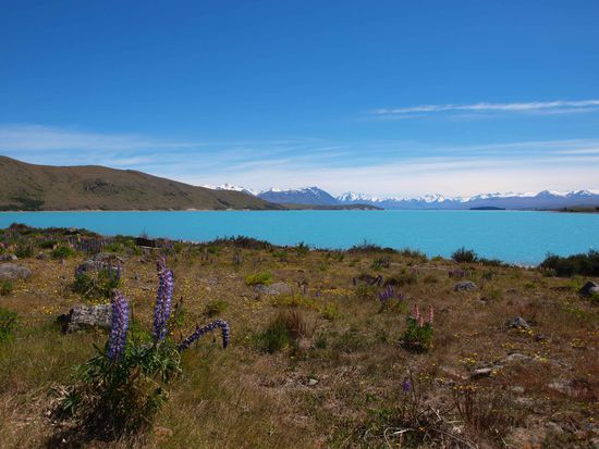 Unsere Gebete sind erhört worden und Karl unser neuer Busfahrer ( Er ist der erste der diesen Begriff wirklich verdient hat) heißt uns im Bus willkommen. Auf der Fahrt bis zum Lake Tekapo kaufen wir Fleisch und Salat, für ein BBQ mit dem ganzen Bus, ein. Gegen 17.30 Uhr beginnen wir das Fleisch zu grillen und lernen eine zierliches kleines Mädchen namens Anna aus Bad Oldeslohe kennen. Sie ist allein unterwegs und hat schon die ein oder andere lusitge Geschichte erlebt. Wir feiern an diesem Abend unser Bergfest (Hälfte der Reisezeit) und der Abend wird richtig lustig! Zur Feier des Tages gabs auch Deutsches Bier