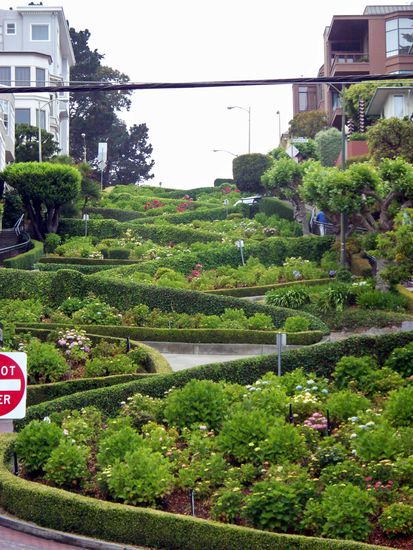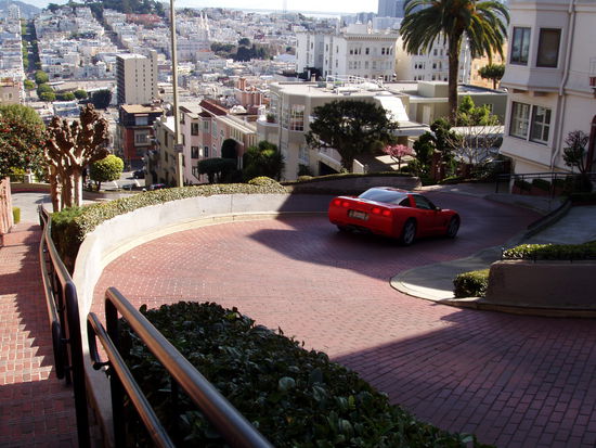 aus unserer To do Liste zu streichen und so fuhren wir zur Lombard Street, der kurvenreichsten Straße der Welt. Der berühmte Teil der Straße liegt auf dem Russian Hill und erstreckt sich über lediglich einen Block zwischen Hyde Street und Leavenworth Street. An dieser Stelle hat sie ein Gefälle von 27 % und verläuft daher in Serpentinenform als Einbahnstraße bergab. Die gepflasterte Straße besteht auf einer Distanz von 145 Metern aus acht Kurven, zählt man die Kurven am Anfang und Ende mit, sogar aus zehn. Um ein paar Fotos zu schießen hielten wir mitten im Kurvengewühl an. Da von hinten schon ein Auto in Sicht war holte sich Claudi in der Hektik einen Pferdekuss an der Autotür, an dem sie immer noch ihre Freude hat.