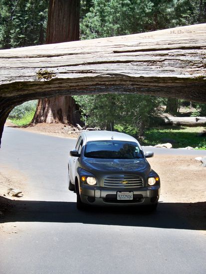 Er ist mit knapp 84m Höhe zwar nicht der höchste Baum, aber aufgrund seines ungeheuren Volumens von 1489 Kubikmetern ist er die insgesamt größte Pflanze der Erde. Um den Baum zu erreichen muss man ca. einen Kilometer vom Parkplatz aus zu Fuß gehen. Nach diesem Fußmarsch setzten wir unsere Fahrt durch den Giant Forest fort und bogen nach ca. 4 Km links in den Tunnel Log ein. Quer über dieses schmale Sträßchen liegt ein Sequoia, durch dessen Stamm ein Tunnel führt.