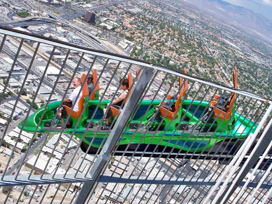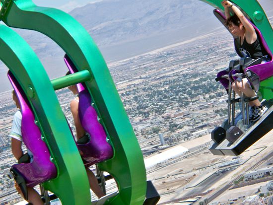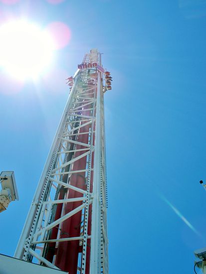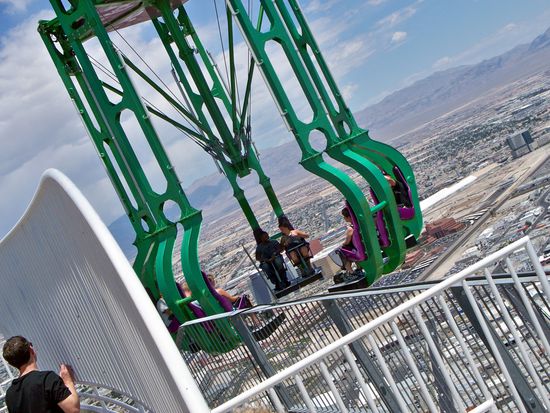 Wir kauften uns Karten für den Lift und die drei Rides, die sich oben auf dem Turm in knapp 300m Höhe befinden. Mit dem Expresslift wird man in einer halben Minute hochgebeamt und kann sich dann dem Nervenkitzel hingeben.