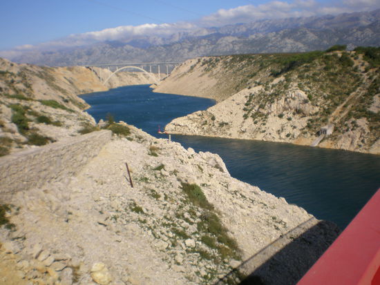Über kleine Nebenstraßen fuhren wir am Morgen in Richtung Velebitkanal. Bei diesen Velebitkanal handelt es sich um die Meeresfläche, welche sich von Novi Vinodolski bis nahezu nördlich von Zadar erstreckt und einerseits vom Festland und andererseits von den Inseln Pag, Rab und Krk begrenzt wird. Bei Maslenika verengt sich dieser Kanal auf wenige Dezimeter und wird von zwei Brücken überspannt, von welchen ein spektakulärer Ausblick geboten wird.