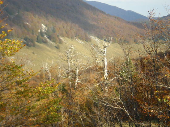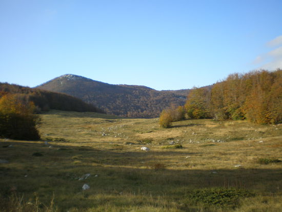 Eigentlich wäre ich gerne weiter über Bacic-Duliba in Richtung Stirovaca gefahren. Diese Straße vührt unterhalb dem 1624m hohen Satorina vorbei. Da die Straße aber weiß in der Karte eingezeichnet ist und der Aufstieg bisher schon die Nerven meines "Besten Stückes" arg strapaziert hatte, einigten wir uns auf die etwas weitere, gelb eingezeichnete Strecke über Gospic, Klanac und Bacovac in Richtung Stirovaca. Diese Stecke ist bis Bacovac landschaftlich nicht so interessant, stieg aber kontinuierlich bergan. Dann fuhren wir lange durch Wald und plötzlich wurde aus der Teerstrasse eine Schotterpiste. Zum Umkehren hatten wir aufgrund der schon gefahrenen Zeit keine große Lust und die Schotterstrecke war auch recht gut zu fahren. Also weiter! Nach ca. 4 km begann kurz vor Stirovaca wieder der Teerbelag. Stirovaca, so scheint uns, besteht aus einem Gebäude des Kroatischen Alpen(?)-Vereins.