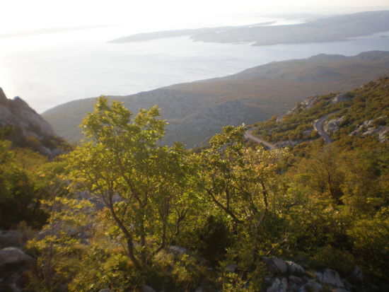 Von Starigrad Paklenica aus kann man den Nationalpark Paklenika, einen Gebirgsnationalpark, erkunden. Neben einer Schlucht hat er eine sehenswerte Höhle zu bieten. Die Höhle kann Montags, Mittwochs und Samstags bis 14:00 Uhr besichtigt werden, wir waren mal wieder zu spät daran und so steht auch dieser NP auf der Liste für spätere Reisen. Also fuhren wir weiter auf der interessanten Uferstrasse in Richtung Rijeka. Hinter Karlobag zweigt die Haupstrasse 25 ab, auf der Karte mit engen Serpentinen eingezeichnet. Sie führt auf kürzeste Distanz von 0m/NN auf 928m/NN und bietet Ausblicke auf das Meer mit den vorgelagerten Inseln, die uns immer wieder zum Anhalten veranlaßten.