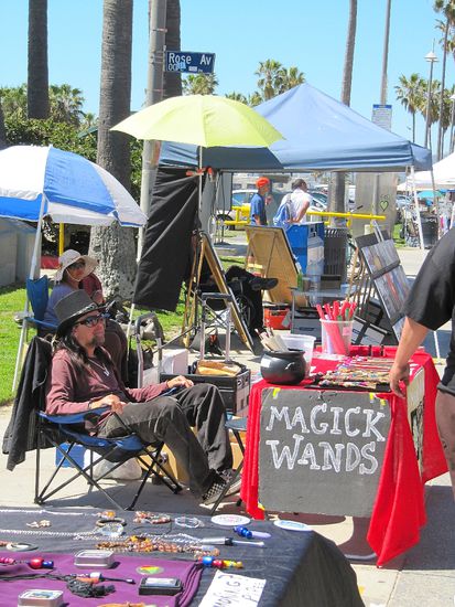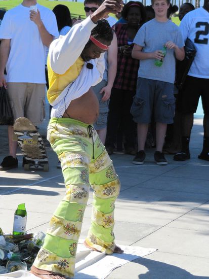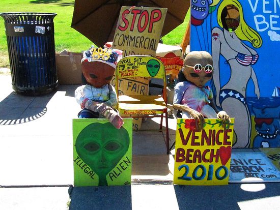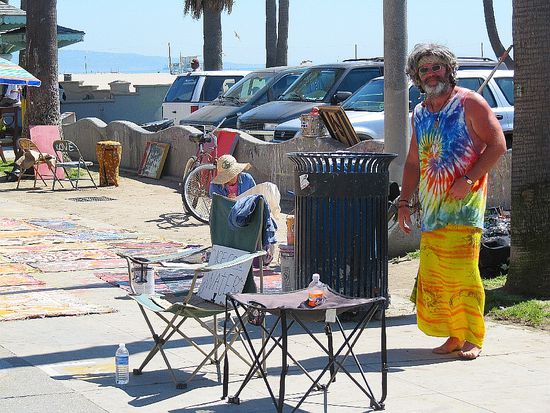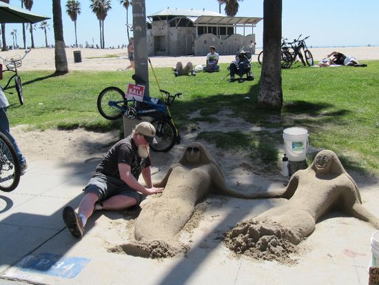 Einen ersten Eindruck von den Baywatch-Türmen und SonnenanbeterInnen hatten wir uns schon verschafft, am Venice Boardwalk lernten wir dann die shiny happy people kennen Alte Hippies in Batik gewandet, Selbstdarsteller, die für Geld auf Glasscherben herumsprangen, Schildkröten mit 2 Köpfen, 2 m große Muskelprotze, Penner die um etwas Geld für etwas Weed baten ("Why lie, I need weed. All your donations will be smoked", Tschantsch, Ramsch und Kunsthandwerk, Mädels in Bikinis, Skateboarder und Inliner, Wahrsager und Tarotkartenleserinnen....Auf mehreren hundert Metern tummeln sich die buntesten, verrücktesten Menschen die man sich nur vorstellen kann. Sollten wir nochmal bei unserem Rückweg am Venice Beach vorbeikommen, die Freakshow steht schon auf der To-do Liste.