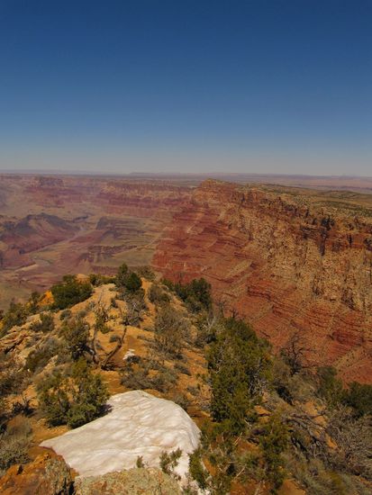 Nach dem reichhaltigen Frühstück mit den Mini-Donuts machten wir uns dann zum Grand Canyon auf, um die vier View Points anzuschauen, die sich Papa notiert hatte. Den ersten (Mather Point) haben wir gleich abgehakt inkl. Kleinstwanderung, für den zweiten wollten wir nicht mit dem Shuttle-Bus fahren (wir sind ja scheinbar total im Freizeitstress), den dritten haben wir übersehen (Grandview) und den vierten haben wir dann wieder gefunden (Moran Point). Auch das Mittagessen fiel wieder extrem reichhaltig aus - Papa gönnte sich stilecht eine Bratwurst und dann wurde schon das nächste Ziel angepeilt: Page, wo wir eine Wanderung im Antilope Canyon machen wollten.