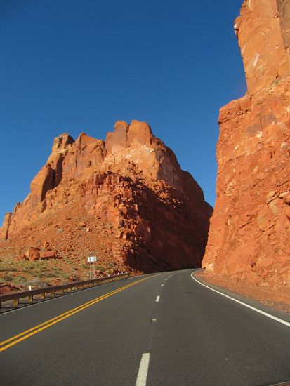 Dabei entdeckten wir, dass in Page der Stausee Lake Powell beheimatet ist - und der kann sich echt sehen lassen...atemberaubend schön. Danach checkten wir das von am rappigsten aussehnde Hotel (Page Boy) aus und wurden angenehm überrascht. Diesmal war's sogar warm Und wir hatten eine eigene Terrasse. Bei Sonnenuntergang speisten wir dann im Steakhouse gegenüber und wurden von Colt-tragenden Cowboys mit teils russischem Akzent bedient, die es sehr lustig fanden, dass wir auf die Frage "Do you belong to any group?" mit "We are the group" antworteten. Unser zuständiger Kellner schwitze wie verrückt und war scheinbar total im Stress, weil wir dauernd alle Brötchen wegaßen und er uns ständig neue bringen musste. Aber lecker war's, und beim Frühstück waren diesmal sogar Cornflakes und Muffins inkludiert! Soviel Luxus für wenig Geld