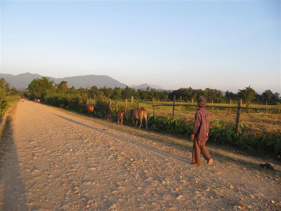 Wir sind dann noch ein bisschen rumgefahren waehrend die Bauern ihr Vieh heimgetrieben haben. Ich mein, auf der Fahrt nach Vang Vieng sind uns mitten auf der Strasse schon mindestens (insgesamt) 60 Kuehe begegnet...mal allein...mal zu zweit...mal in der Herde. Aber wenn du mit dem Fahrrad faehrst und dir laufen ploetzlich 20 Kuehe entgegen (auch wenn sie auf ihrer Strassenseite bleiben), ist das schon etwas ...eigen...und wenn du dann noch ein Kalb mit dem Fahrrad ueberholst...ebenso.