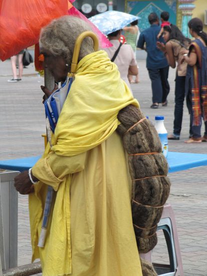 - kahlrasierte Kinder mit gelbgepuderten Koepfen, die sich wohl einen Segen holten - soll Glueck bringen oder so
