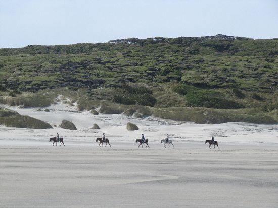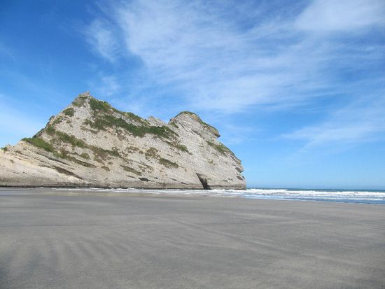 Nächster Stopp war Farewell Spit. Das ist eine Bird Sanctuary, also kann man nicht drauf, aber vom Cafe aus konnte man mit Teleskop den dünnen Strandstreifen sehen. Der ist auch deshalb so besonders, weil hier die meisten Wale stranden. Nicht dass das super wäre, aber es passiert immer wieder mal. Auch letztens, als es bei euch in den Nachrichten war. Das Strandstück ist so schmal, dass minimale Fehler beim Echoloten der Wale auf die Sandbank führen. Warum das passiert, sind sich die Leute nicht sicher. Vermutlich, wenn ein Wal sehr alt oder krank ist und ihm die restliche Familie dann folgt. Diesmal konnte ihnen nicht mehr geholfen werden. Die die noch nicht tot waren, denen hat mans leichter gemacht. Aber sie bleiben dort liegen. Auch im Golden Bay direkt stranden öfters welche. Mitte der 90er sind einmal fast 400 Wale hier gestrandet. Es sind allerdings eher kleinere, auf englisch heißen sie Pilot Wales. Wenn so etwas passiert, werden jede Menge Freiwillige gebraucht, um sie nass zu halten und mit Hilfe von kleinen Booten wieder in tiefere Gewässer zu ziehen. Vicki war auch mal bei sowas dabei.