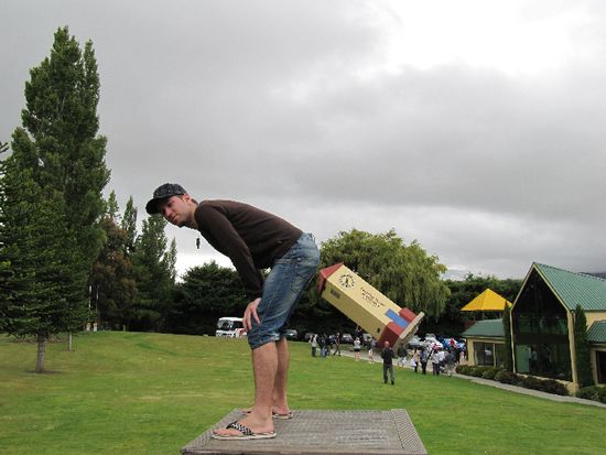 Puzzlingworld ist ein kleiner Themenpark mit optischen Illusionen. So irrten wir zuerst einmal mindestens eine halbe Stunde durch einen Irrgarten, wie alle andren im Übrigen auch, und ließen uns danach im Inneren des Gebäudes noch von allen möglichen Räumen und Bildern täuschen. Nachdem wir noch ein Foto geschossen hatten, wo Andi der schiefe Turm im Hintern steckt, fuhren wir weiter nach Queenstown. Und....es regnete schon wieder.