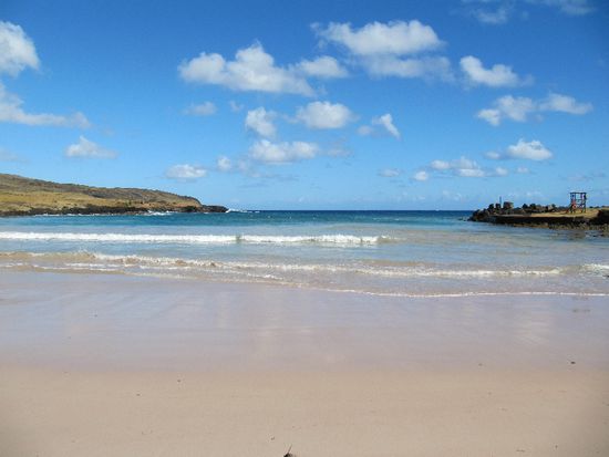 Für den nächsten Tag stand der einzige Strand von Rapa Nui auf dem Plan: Anakene. Gemeinsam mit Diana, Karin, Gili und dem Hund Bianca quetschten wir uns quasi zu sechst in den kleinen staubigen Suzuki Jimney und folgten einer der zwei holprigen Straßen, die über die Insel führen. Wir staunten nicht schlecht - Anakene kann sich wirklich sehen lassen, alle Achtung - weißer Sand, Kokospalmen, ein paar Moais (das sind die mysteriösen Steinfiguren, für die Rapa Nui bekannt ist) und wunderschönes Meer. (Hier war übrigens der polynesische König angekommen, der die Insel bevölkerte.) Ok, der "Bademeister" war auch nicht ganz zu verachten Ein traumhafter Ort jedenfalls für ein gemeinsames Frühstück und ein paar sonnige Stunden.