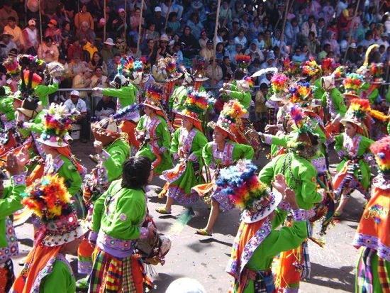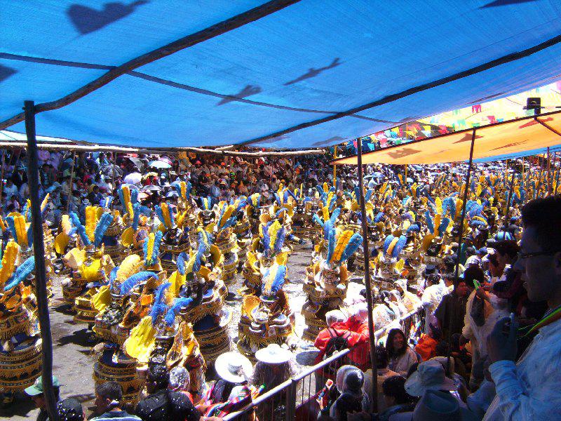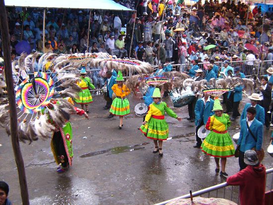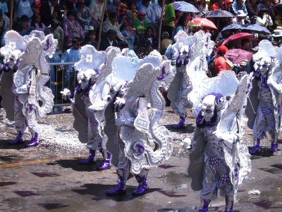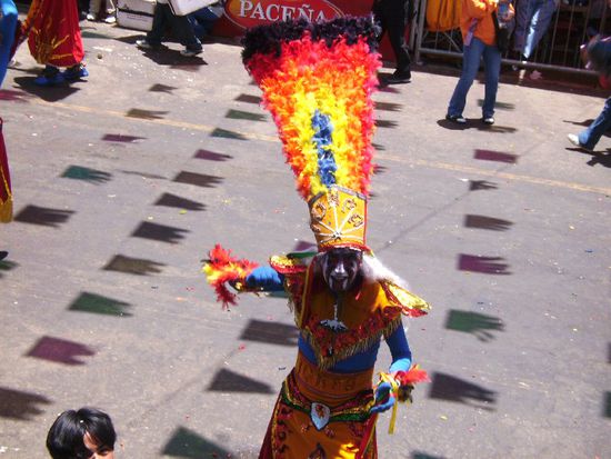 Von den VerkäuferInnen probierten wir so ziemlich alles was, was zu bekommen war - Schokoerdbeeren, Chips, Sandwich, Götterspeise...nur kein Bier. Die Aussicht wieder von der Tribüne runter kommen zu müssen, besprüht zu werden usw nur um einmal Pinkeln gehen zu können, war nicht so toll. Irgendwann später machten wir dann eh mal eine Paradepause und ergatterten ein Hühnchen mit 3 Beilagen um nur 10 Bolivianos (weniger als 1 Euro!). Für den Abend zogen wir uns dann mitten im Internetcafe um, weil draußen wars ziemlich kalt und schauten uns noch ein bisschen Parade an. Mit Fortgehen war dann nix mehr, weil wir einfach viel zu müde waren.