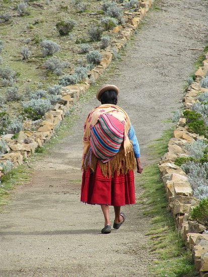 Erst eine Stunde vor Ende unserer Tour, begegnete uns eine Einheimische...die sich für 2 Bolivianos fotografieren ließ und wenig später hüpfte ein lustiger Fischer daher, der meinte, er sei im Lonely Planet. Ich hatte nur die paar notwendigen Seiten rausgerissen und mit, weil der ganze Wälzer einfach zu schwer gewesen wäre (wir waren ja nur mit kleinem Gepäck unterwegs). Während der Fischer ins Haus lief um seinen Lonely Planet zu holen, schauten wir auch nach - und wirklich, da war explizit einer erwähnt: Hilario Paye, der einen mit seinem Boot auf die Insel mitnehmen konnte und gerne mal was erzählte. Und dann kam er schon wieder angewuselt und zeigte uns seinen Namen in jedem Buch, das er hatte und sogar ein Foto in einem Travelmagazin. Auf ziemlich schnellem Spanisch erklärte er uns alles mögliche über die Inka (was wir nicht alles verstanden haben) und, dass wenn man den Titikakasee auf einer Karte zur Hälfte bedeckt (der Länge nach), zeigt eine Hälfte ein Puma, und die andere eine Forelle. Der See bedeutet ja einerseits glaub ich Pumasee und hat auch auf der Isla del Sol einen Pumafelsen, sowie die Boote der Uros (schwimmende Inseln) haben auch Pumaköpfe drauf - und andererseits ist der See für seine guten Forellen bekannt. Hilario erzählte uns auch ganz stolz, dass schon mal ein Österreicher ein halbes Jahr hier gewesen sei und dann nahm er uns mit seinem Motorboot mit. Wir legten noch einen kleinen Zwischenstopp auf einer Halbinsel ein, auf der er uns eine Bucht zeigte, und wie man mit den einem Aymara (indigenes Volk)-Wurfgerät, das eigentlich nur ein geknotetes Band ist, mit Steinen Vögel schießen konnte. Ganz so gut zielen wie er konnten wir nicht - allerdings haben wir uns auch nicht an Enten versucht, sondern auf die Tourifähre gezielt Danach haben wir uns an den äußersten Zipfel der Sonneninsel aufgemacht. Andi hat im gemächlich hintuckernden Boot eingenickt, Hilario ebenfalls. Er ist aber zumindest immer wieder mal aufgewacht, um zu lenken. Das hat mich dann wieder beruhigt.