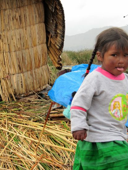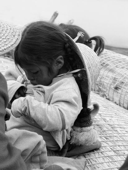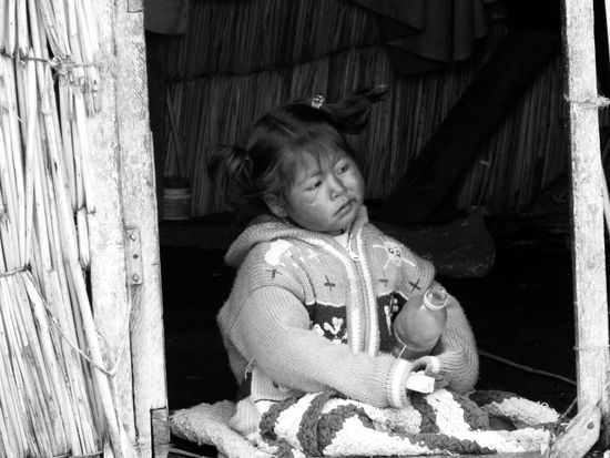 Nach dem Mittagessen waren wir wiedermal plumpsatt und der Neffe Santos hatte nun die Aufgabe, uns zum Abfahrtshafen zu bringen. Nachdem ich schon alle Äpfel verschenkt hatte, die wir auf die Insel mitgebracht hatte, erspähte ein kleines Mädchen noch die Farbstifte, die ich in einem durchsichtigen Sackerl transportierte. Am Hafen in Puno wurden ja zahlreiche Dinge als Geschenke für die InselbewohnerInnen verscherbelt - meist aber Süßes, was ziemlich schlecht ist, weil es ja keinen Zahnarzt gibt. Darum hatte ich mich für Stifte entschieden, die sie freudig entgegen nahm und sogleich kam eine Schar an weiteren Kindern, die auch was haben wollten. Tja, Fehlanzeige, nix mehr vorhanden.
