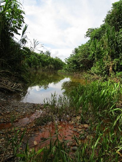 Später unternehmen wir erst per Boot und dann zu Fuß eine Wanderung zu einem Fischteich, bei dem es in der Nacht auch ein paar Kaimane zu sehen geben soll. Fische waren offensichtlich nicht viele drinnen. Omar hat nur einen erwischt. Ebenfalls zeigt uns Abel ein paar für Natives wichtige Bäume (Milktree zB), deren Saft zum Kurieren von Magendarmbakterien und ähnlichem verwendet wird. Auf unserer Floßfahrt einmal im Hellen und einmal im Stockdunkeln genießen wir die Geräusche rund um uns - Regenwaldsound hat echt was. Da kann das Vogelgezwitscher in der Sauna daheim nicht mithalten