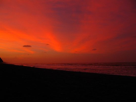 Dafür hatte es der Sonntagabend dann in sich - erstens wunderschönster Sonnenuntergang ever, und zweitens 5 Schildkröten auf dem Walk. Kurz vor Ende fing Carlos plötzlich zu rennen an, und da sahen wir schon eine riesige Leatherback im fahlen Mondlicht. Und dann rannte er noch ein Stück - und gleich ein paar Meter weiter kam die nächste raus! Gleichzeitig. Wir bewachten die 2 also bei ihrem recht zügigen weg auf den Strand für den Fall das Poacher kommen, als plötzlich der Mond ganz zum Vorschein kam. Da waren die Schildkröten nicht so begeistern. Eine drehte gleich um, die andere grub noch ein bisschen und entschied sich dann für den Rückweg, als plötzlich noch eine dritte (in der Mitte) an den Strand kam - die drehte aber auch bald um. Ganz egal. Was ich mir bis zum Schluss gewünscht hab, war einmal eine aus dem Wasser kommen zu sehen, und wieder reinzugehen. Denn Eierlegen hatte ich schon, und beim Vermessen durfte ich auch mal helfen. Happy End also.