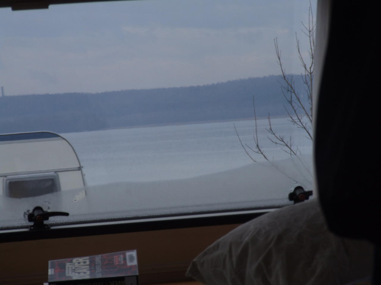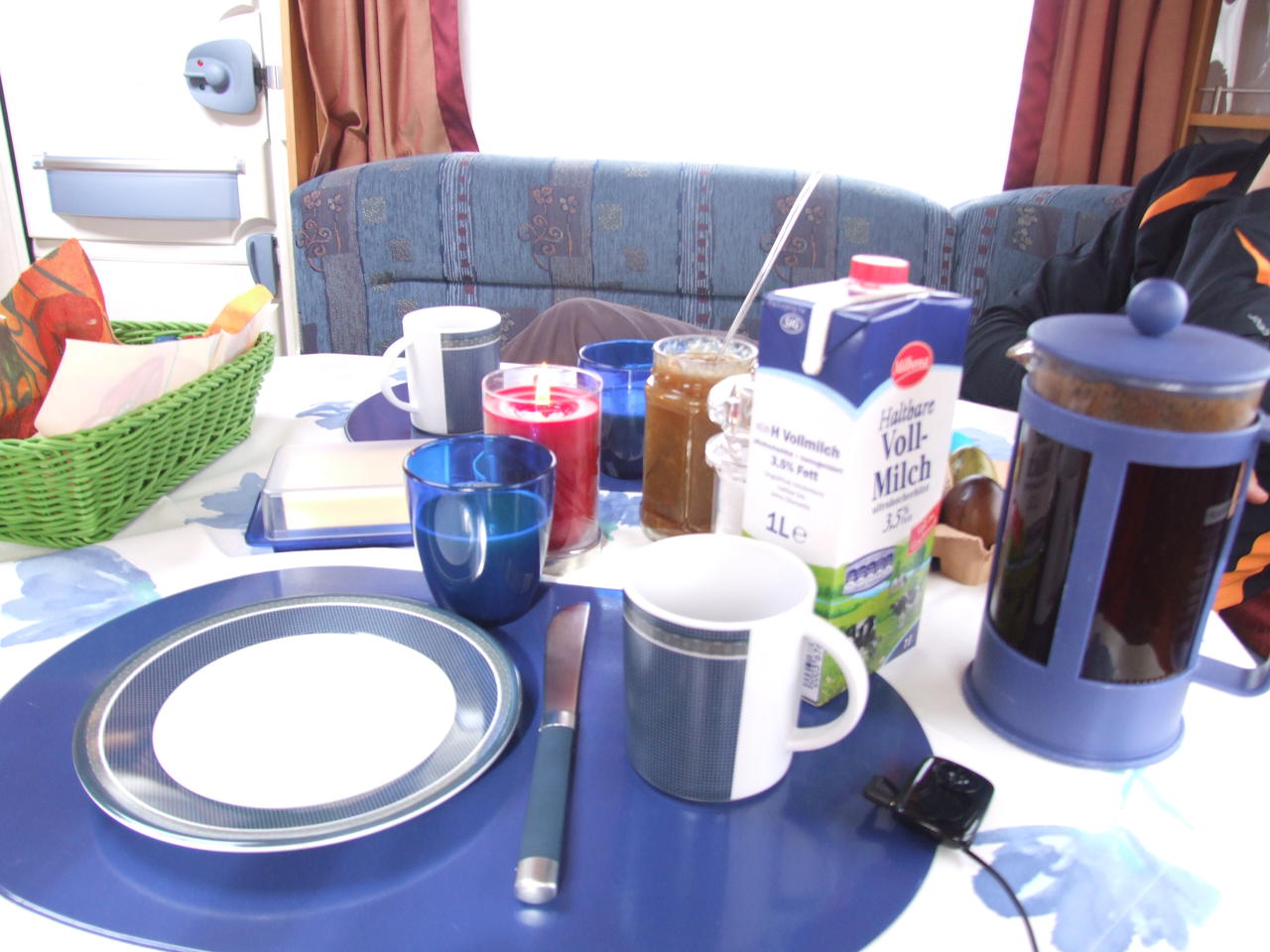 Am nächsten Morgen ist es doch recht frisch im Wohnwagen. Ich bleibe im Bett liegen, bis mein Mann die Heizung angestellt hat und mich das Frühstück mit dem Duft von Kaffee und frischen Brötchen aus den Federn lockt. Gleichzeitig genieße ich den Blick vom Bett aus direkt auf den Bodensee. Das hat doch wirklich was!