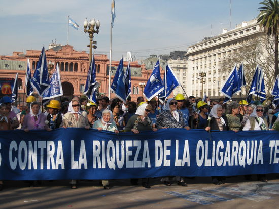 Seit über 30 Jahren treffen sich die aelteren Frauen jeden Donnerstag um 15 Uhr zum stummen Protest und marschieren um das Denkmal an der Playa de Mayo direkt vor dem Regierungsgebäude. Als in Argentinien in den 70er Jahren die Militaerdiktatur herrschte, sind ihre Kinder und Ehemänner spurlos verschunden, begannen sie schweigend vor dem Regierungsgebaeude zu protestieren.