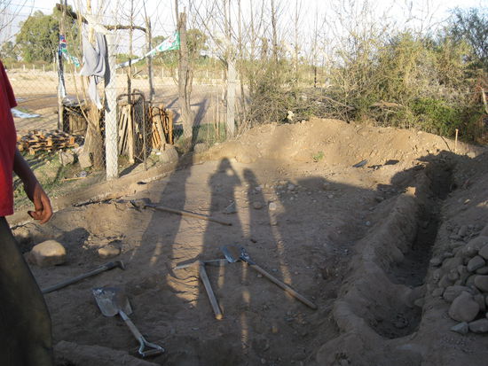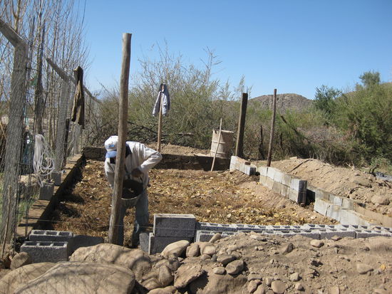 Das Mauerfundament wird gebaut. Auf der einen Seite entsteht eine hohe Mauer als Schutz vor Wind, Wetter und Staub.