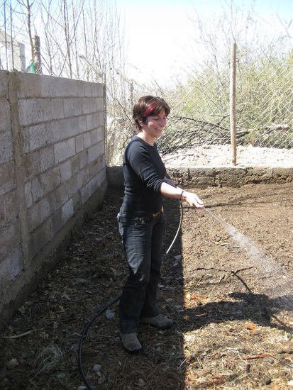 Mein letzter Tag - vormittags - geduldig beim Bewässern des Bodens mit dem Wasserschlauch. Damit die fruchtbare Erde nicht einfach weggeschwemmt wird, benutzen Julian und ich den Schlauch und spritzen und spritzen den ganzen Vormittag. Damit der arg trockene Boden auch richtig schön durchgewässert wird.