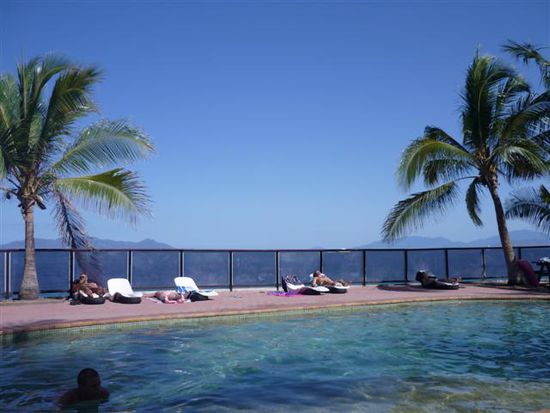 von einem paradies ins naechste...nach airlie beach und den absolut traumhaften whitsundays gings weiter nach townsville, von wo aus wir die faehre nach magnetic island genommen haben...leider waren wir noch nie so bepackt wie an diesem tag...also wir sind ja schon imemr wirklich hammermaessig ueberladen und das umziehen von hostel zu hostel gehoert echt zu den lustigsten momenten hier, wir immer am 20 kilo und 7 taschen rumschleppen und fast nach hinten umkippen das ist immer ein spass sag ich euch, wir sehen immer aus wie die totalen vollspasten, werd bei gelegenheit mal nochmal n foto machen auf jeden fall hatten wir dieses mal nicht nur die ueblichen 3 taschen, backpack, rucksack vorne und riesen handtasche, sondern auch noch ungefaehr 8 einkaufstueten...und das bei 35 grad...da koennt ihr euch mal vorstellen, wie das ausgesehen hat und wie wir aussahen, nach dreimal rucksack hoch, rucksack runter^^ wir waren sogar so bepackt, dass wir stecken geblieben sind im busgang total fertig und durchgeschwitzt kamen wir dann aber irgendwann im base backpackers an, zusammen mit rachel und sabrina, und uns hats fast umgehaun...das hostel war einfach nur der hammer, direkt am strand, megageiler pool, komplett offene veranda, palmen direkt vor der haustuer und ein ausblick, einfach nur traumhaft schoen!