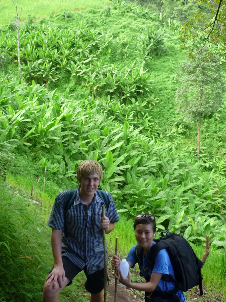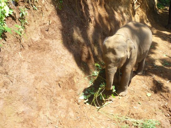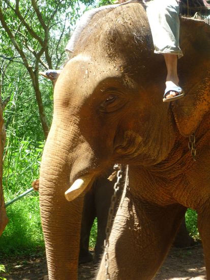 Nach 1-stündiger Fahrt sind wir dann am Elefantencamp angekommen. War schon eine interessante Sache auf so einem riesen Elefanten auch noch zu Reiten, allerdings waren diese sehr stur und unsere Guides mussten doch etwas nachhelfen damit sie sich überhaupt in Bewegung gesetzt haben. Denke es gehört dazu, aber ein bisschen leid haben mir die Tiere doch schon auch getan. Nach dem Mittagessen ging es dann zu Fuß weiter in die Berge, wo wir übernachtne sollten. War echt super froh meine dicken Bergschuhe mitgeschleppt zu haben, denn es ging wirklich mitten durch den Dschungel, unter Bananenstauden durch oder mal über derbe Felsen und das meistens steil bergauf. Da die Natur und alles drumherum einfach so begeistert haben, hab ich gar nicht so richtig gemerkt, dass eigentlich schon alles vor Schweiß glitsch nass war. Leider hatten nicht alle so ordentliche Schuhe mit und so ist eine nette Münchnerin, auf halber Strecke weggerutscht und hat sich das Kreuzband gerissen...