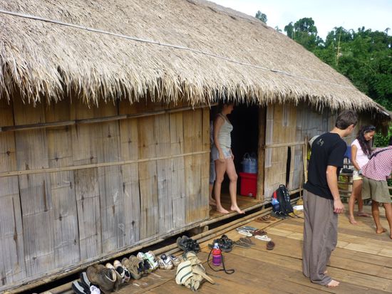 Oben angekommen, erwarteten uns schon die thailändischen Ureinwohner. Unser Quartier bestand aus einer Bambushütte mit Matten auf dem Boden und sonst weiter Nichts. Weiter unten gab es noch ne kleinere Hütte mit einer Regentonne drin, die das Bad darstellen sollte. Nicht für immer aber für eine Nacht doch ein echtes Abenteuer. Nach gelungenem Abendessen hatte unser Guide als Appetithäppchen sogar noch ein paar Maden und Würmer für uns gesammelt! Da ich aber leider zu satt war, war in meinem Magen fürs erste kein Platz mehr dafür. Laut den verrückten Holländern, haben diese Dinger aber doch recht gut geschmeckt. Haben den Abend dann mit der Gitarre und ein paar Changbeer bei Kerzenschein ausklingen lassen. Die thailändische Interpretation von manchen Songs lässt sich auch nur mit einigen Dosen Bier ertragen, aber trotdem wars echt schön!