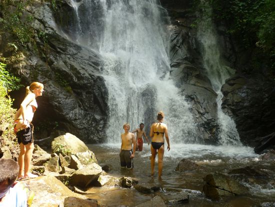 Am nächsten Morgen gings dann wieder ordentlich bergab und unterwegs dann noch eine nette Abkühlung unterm Wasserfall. Das Letzte Highlight war dann noch ein wahnsinns Raftingtour. Da wir ja gerade Regenzeit haben, war der Fluss echt reisend schnell und das Getose hat man schon kilometerweit gehört. Mit Schwimmweste und Helm gings dann ab und zwar so richtig.