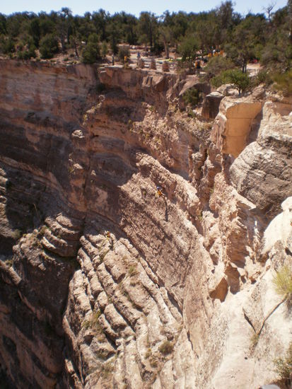 Ziemlich abgefahren war auch die Muellbeseitigung im Park. Wenn man ganz genau hinschaut erkennt man an der Felswand einen kleinen, gelben Punkt mit Helm. Das ist die Muellabfuhr des Canyons. Die Bergsteiger haben eine Tuete dabei und sammeln den Abfall auf den Felsvorspruengen auf.
