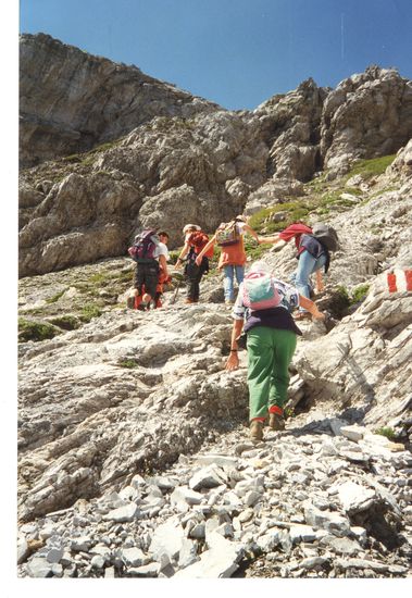 Über einen Wirtschaftsweg zur Bergstation der Zehnerkarspitzbahn führte uns der erste Anstieg. Nach einer Erholungspause ging es dann ans Eingemachte. "Trittsicherheit und Schwindelfreiheit sind von Nöten" stand auf einem Schild zu Beginn der 4 Gipfel-Tour. Schon der erste Gipfel, die Zehnerkarspitze (2381 Meter) mit einigen Kletterpassagen bedurfte besonderer Aufmerksamkeit. An einer Stelle musste sogar mit einem Seil gesichert werden. Nach Erreichen des Gipfels führte uns der weitere Weg über den Bergkamm, entsprechend einer Berg und Talbahn, von Gipfel zu Gipfel. Nach der Zehnerkarspitze folgten Klöckerin (2432 Meter) sowie die Hintere Großwandspitze (2436 Meter). Der Pleißlingkeil, der Höchste und letzte dieser vier Berge (2501 Meter), forderte uns alles ab. Der anschließende Abstieg über steiles, schotteriges Gelände mit Rest-Schneefeldern zur Südwiener Hütte war allerdings auch nicht von schlechten Eltern. Kaputt, stolz und zufrieden genossen wir den Abend auf der Hütte.