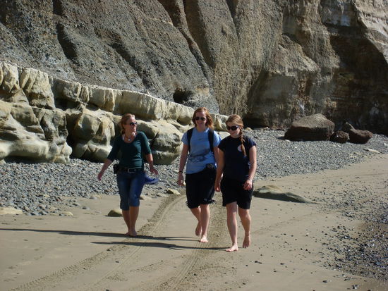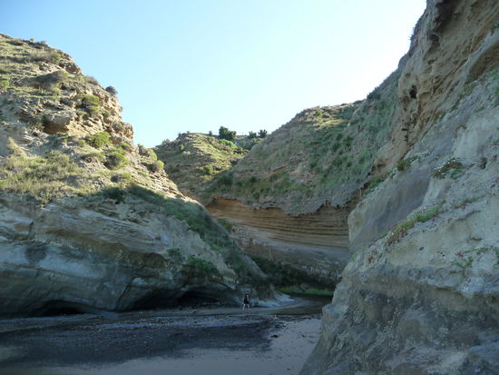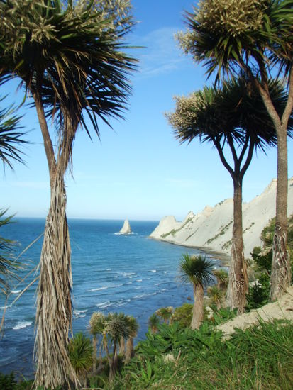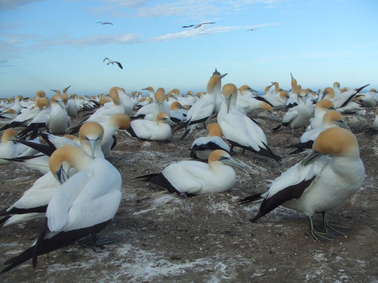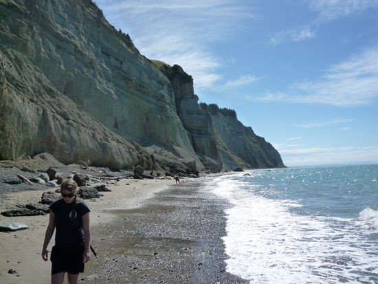 Am Montag gab's bei Sonnenschein, blauem Himmel und kurze-Hose-Wetter dagegen aber mal wieder die Extreme: Mit Inge und Chris (deutsch und im Besitz eines Autos) und Francisco sind wir zum Meer gefahren, wo wir etwa 16 km am Strand entlang zum Cape Kidnappers gegangen sind. Ein schöner Spaziergang in einer atemberaubenden Landschaft: blaues Meer, toller Sandstrand, Steilküste. Je näher wir dem Cape kamen, desto mehr Vögel gab es. An der Spitze war einige riesige Ansammlungen der Australtölpel , die zu tausenden auf einer Stelle zusammenhockten. Das Gewimmel und Getöse mit anzusehen, war wirklich schön.