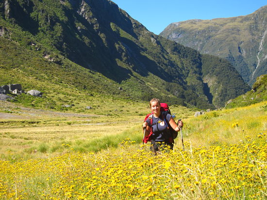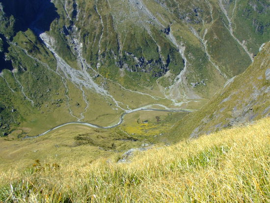 Nachdem wir da oben gegessen haben, mit atemberaubender Aussicht, ging es auf der anderen Seite wieder runter. Der Abstieg war etwa so anstrengend wie der Aufstieg. Man musste höllisch aufpassen, nicht abzurutschen - man wäre tief gefallen. Nach einer Ewigkeit kam auch ich unten im anderen Tal an, welches genauso schön war, wie das erste. Ein paar Kilometer weiter lag dann endlich die Siberia Hut, wo wir neben ganz vielen anderen Leuten die zweite Nacht verbracht haben. Die haben wir diesmal aber im Hellen erreicht, auch wenn wir für nur 12 km genauso lange gebraucht haben wie am Vortag für 20.