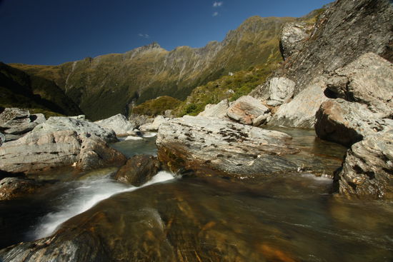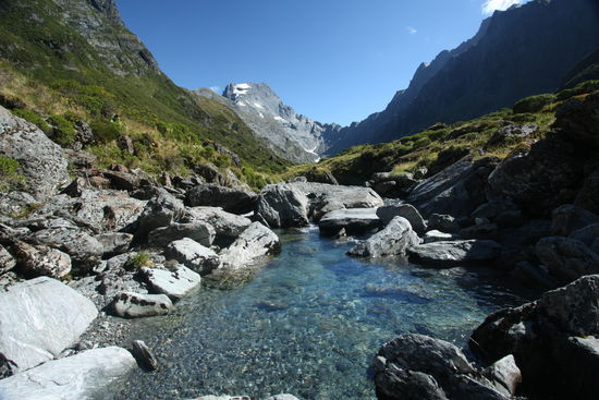 Es folgte ein weiterer Tag, der genauso schön wie anstrengend war, beides ging ins Extreme. Wenn man die schönsten Ecken Neuseelands sehen möchte, dann muss man wandern gehen!!!!! Diese Landschaft ist in den Broschüren abgebildet... und in echt noch viel schöner... Erst ging es einige Kilometer durch hohes trockenes Gras am glasklaren Fluss entlang bis zum Ende des Tals, wo man dann von Bergen umringt war. Am Fuße des Mount Awful, der 2192 m hoch ist und seinem Namen alle Ehre machte, wie ich feststellen musste, haben wir kurz Pause gemacht, dann begann die Kletterpatie. Über drei Stunden habe ich bis nach oben gebraucht. Wenn man einen Berg hochsteigt, denkt man manchmal, dass man gleich die Spitze erreicht hat, ist man an dem Punkt angelangt sieht man aber, dass es dahinter noch viel höher geht. So ging das ungefähr sechs Mal. Auf der Spitze wächst nichts, überall nur graues Geröll und hier und da etwas Schnee. =) Da oben hab ich auch Shai wiedergetroffen, der schon fast eine Stunde gewartet hat. xD
