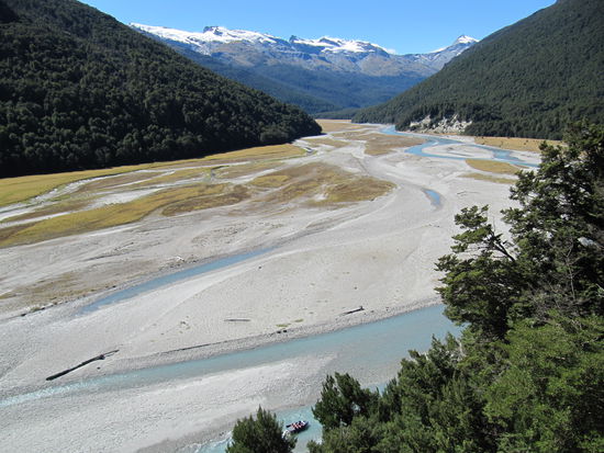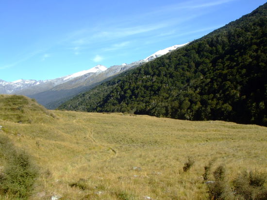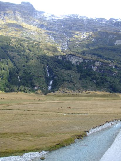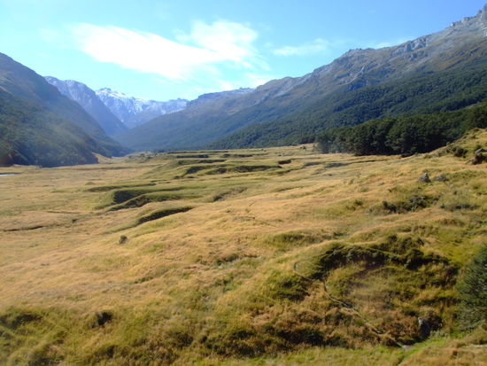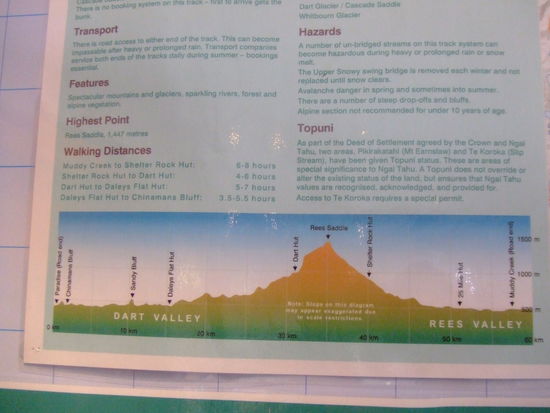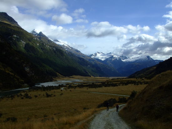 Am dritten Tag wollten wir den Track beenden: 31 km durch's Dart-Tal. Wir sind wieder aufgestanden, als es noch dunkel war. Die ersten vier Wegstunden waren okay, hätten mir aber gereicht. Auf halber Strecke haben wir in einer Hütte, einer Zuflucht vor den blutrünstigen Sandflies, Mittag gegessen, dann ging es weiter. Der zweite Teil war eine riesen Strapaze und nicht nur für mich. Ich war halbtot und der Weg wollte und wollte einfach nicht enden. Immer kam noch ein Wald und dahinter eine Wiese und noch ein Fluss, wieder ein Wald, auf und ab. Es war furchtbar Ich hab mich gefühlt, als wäre ich zusammengeschlagen worden. 4 Stunden lang.