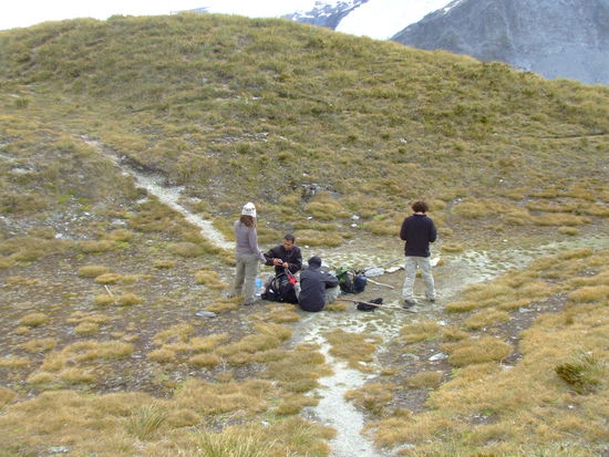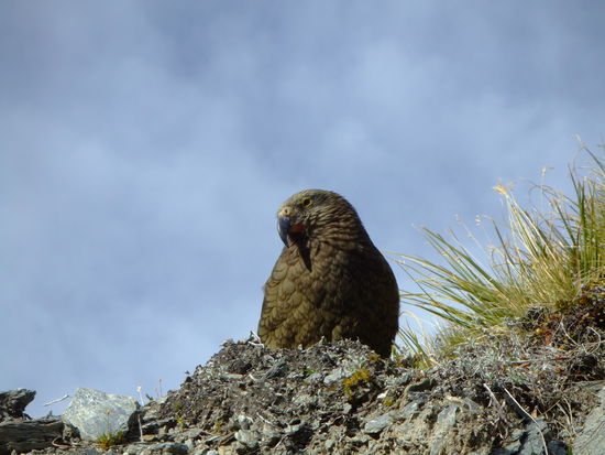 Im Kreis um den Kocher gehockt, damit dieser nicht ausging, haben wir dort etwa eine 3/4 Stunde verbracht. Dann noch etliche Fotos gemacht, wobei wir beinahe über den Rand gepustet wurden, anschließend ging es an den Abstieg. Da der Wind so stark war, mussten wir so schnell wie möglich runter. Was also tun? Rennen. Wie die blöden sind wir also den Berg hinuntergerannt. Das war ziemlich gefährlich, wir haben aber alle überlebt. Im windstillen Teil weiter unten konnten wir dann jede Menge Keas beoachten, Neuseelands wunderschöne grüne Papageien, die die Cleverness eines 6-jährigen Kindes besitzen.