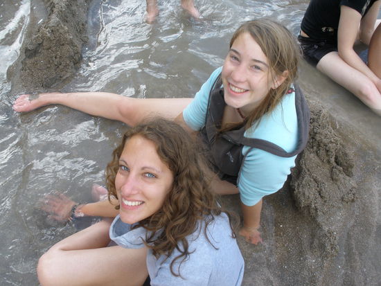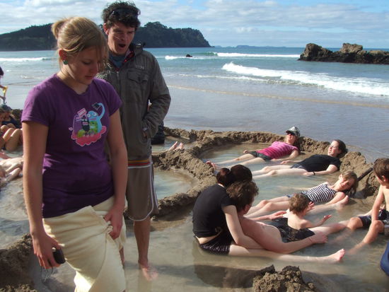 So abgehärtet sind wir (nach der etwa 45 minütigen Wanderung zurück zum Auto) dann zum Hot Water Beach gefahren. Zu einer bestimmten Zeit tummeln sich dort die Touristen: Mit Spaten, Eimern und den eigenen Händen bewaffnet sind alle eine ganze Weile damit beschäftigt, Löcher in den Strand zu buddeln. Aus dem Boden kommt dort kochendheißes Wasser, vom Meer her wird kaltes dazu gemischt und überall in den Erdlöchern sitzen Leute und versuchen verzweifelt, die Wände ihrer kleinen Pools in Stand zu halten und das Wasser zu temperieren. Wir haben uns oft verbrüht, aber es war ein wirklich spaßiger Nachmittag.