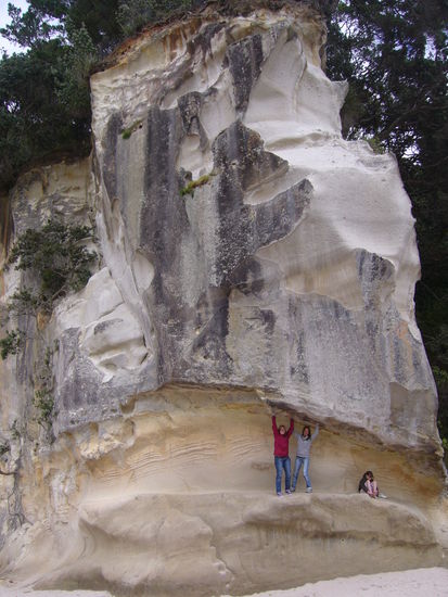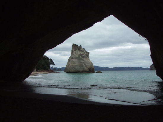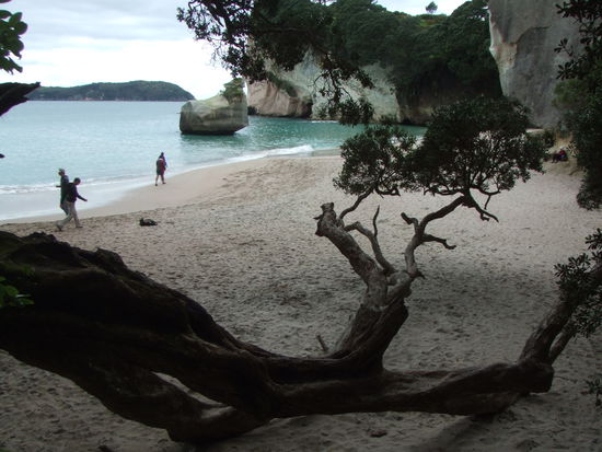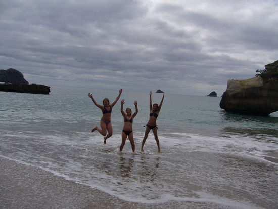 Unser nächstes Ziel war Whitianga, das liegt oben rechts in der Coromandel Region. Dort haben wir uns mit Lena verabredet (mit der wir auch schon in Whangarei und Paihia unterwegs waren). Abends haben wir im Hostel Joe, einen Australier, kennengelernt, der praktischerweise im Besitz eines Autos war und am nächsten Tag mit uns zu Cathedral Cove und zum Hot Water Beach gefahren ist. Cathedral Cove ist einer der schönsten Strände in Neuseeland: Weißer Sand, klares Wasser, malerische, vom Wasser merkwürdig geformte Felsen... Leider haben wir ja immer noch kalten Frühlig hier, die Wassertemperatur beträgt etwa 15°C, vielleicht auch kälter, aber diesen Ort konnten wir nicht unbeschwommen verlassen. Also rein ins eiskalte Wasser. Wenn man nach ein paar Minuten seinen Körper nicht mehr spüren kann, macht einem die Kälte gar nichts mehr aus. Frisch wird es dann erst, wenn man beim Auftauen die Temperatur erreicht, an der man wieder etwas spüren kann...