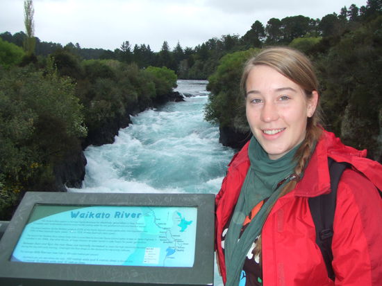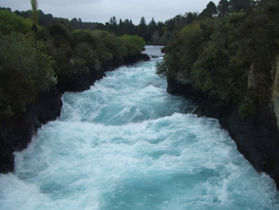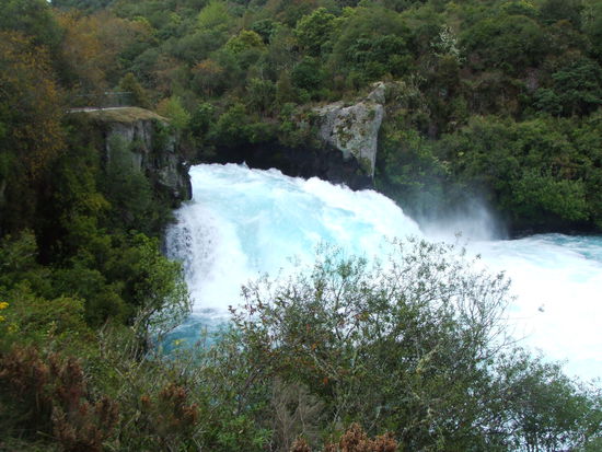 Auf unserem Weg haben wir einen Stop beim Huka Fall eingelegt. Der Lake Taupo hat nur einen einzigen Abfluss, daher preschen gewaltige (klare "hellblaue") Wassermassen (variiert zwischen 32 und 270 Kubikmetern pro Sekunde) im Affenzahn durch einen Canyon.