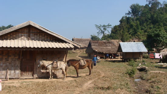 Dann gings mit nem Sammeljeep ins Outback von Bokeo, wo wir dann in einem extrem suessen Dorf schliesslich auf die andere Haelfte der Gruppe trafen. Los. Zuerst liefen wir etwa eine Stunde zum Basecamp...