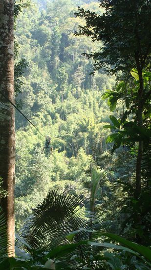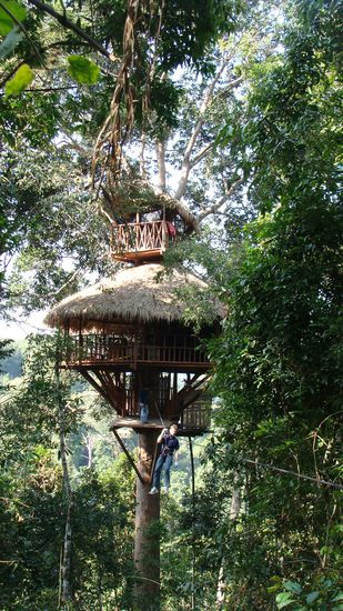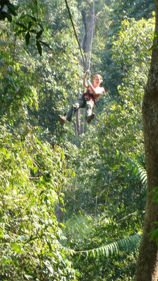 die auf eine spezielle Art von Oekotourismuss setzt... Statt einfach durch den Regenwald zu Trecken, haengt man sich an ein Seil und flitzt von Baum zu Baum... und dabei uebernachtet man zwei Naechte in einem echt coolen echten Baumhaus! Echt ein Kindertraum!!! und gigantischen Spass und super Aussicht garantiert! Jedoch ist jeder Anfang eine Ueberwindung! Weil, ja man ist dopperlt gesichert und man fuehlt sich eigentlich immer total sicher wenn man fliegt, es ist zum Teil verdammt hoch... So auch ich: Ich hatte erlich gesagt verdammt schiss beim ersten Mal, auch wenn die meissten vor mir losgesaust sind...